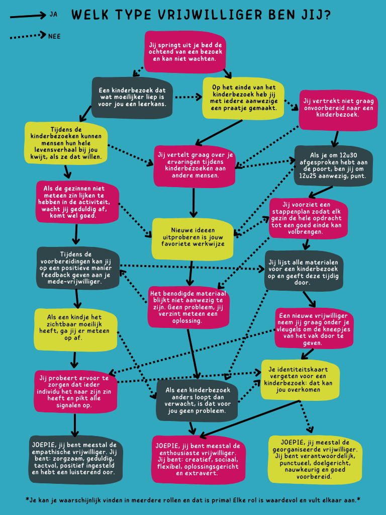 - Wat? Een speelse vragenlijst die jou meer vertelt over jouw begeleidingsstijl tijdens kinderbezoeken. Want je merkte ongetwijfeld al dat niet iedere vrijwilliger hier op dezelfde manier mee aan de slag gaat. Sommigen zijn graag (extreem) goed voorbereid, anderen laten het meer op zich afkomen. Sommigen mengen zich het liefst onder de gezinnen, anderen houden zich liever wat op de achtergrond. En dat is helemaal ok! Hou je vooral aan je eigen stijl, doe waar jij je goed bij voelt en vul elkaar als vrijwilligersteam aan!